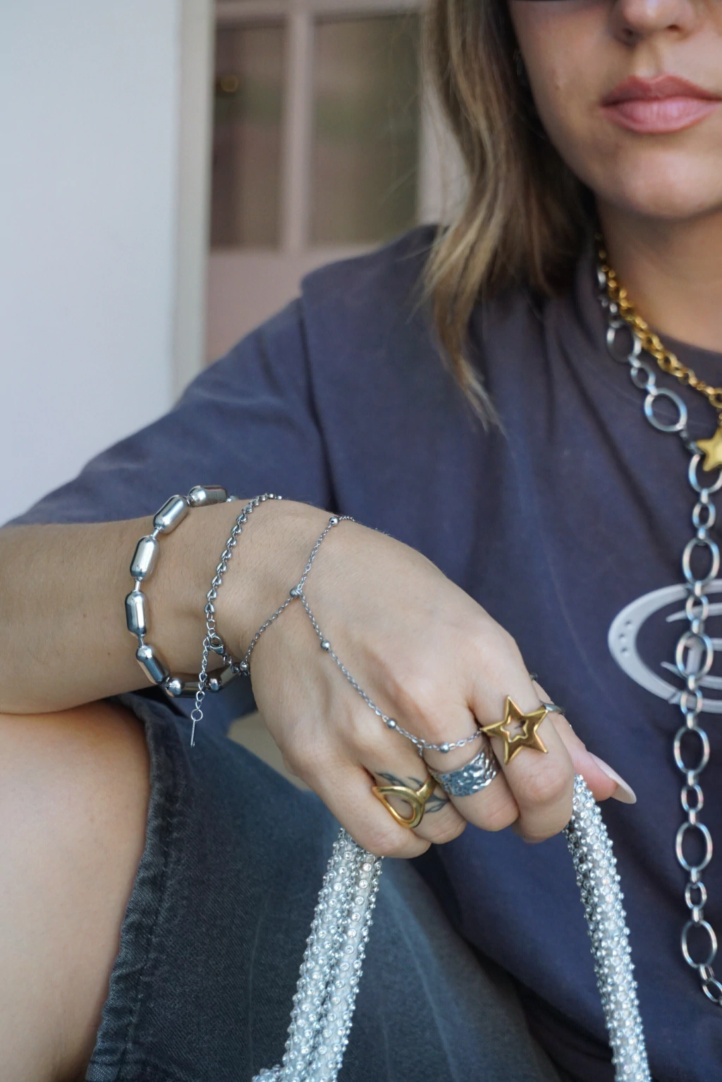 Handchain de acero inoxidable. La parte de la muñeca es regulable hasta 20 cm. El complemento perfecto para tu mano, delicado, sútil y super canchero. No dejes de usarla todos los días!