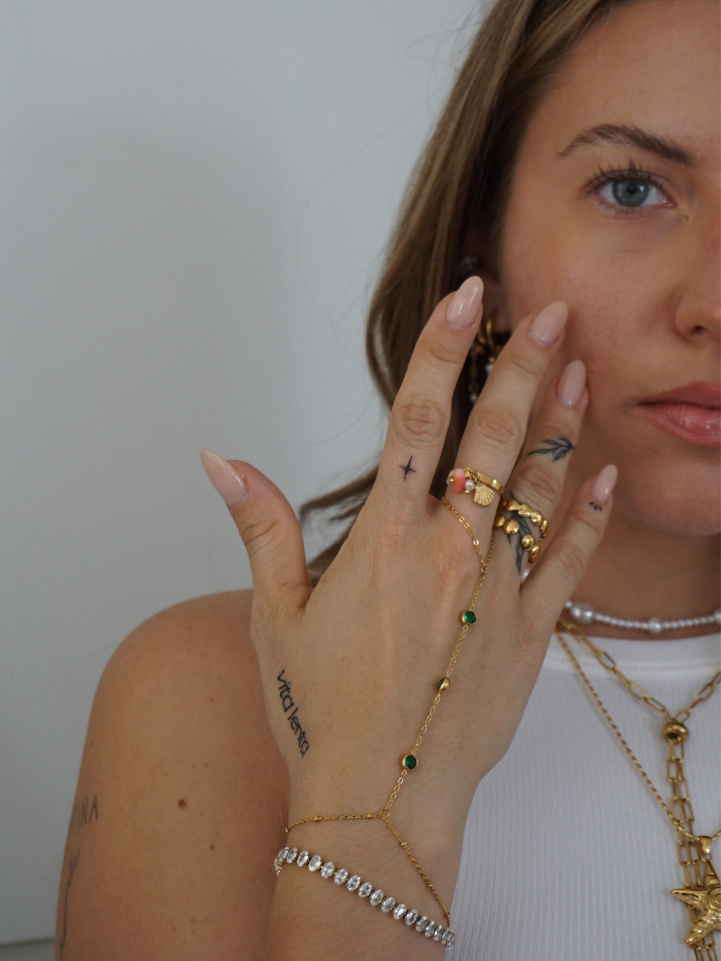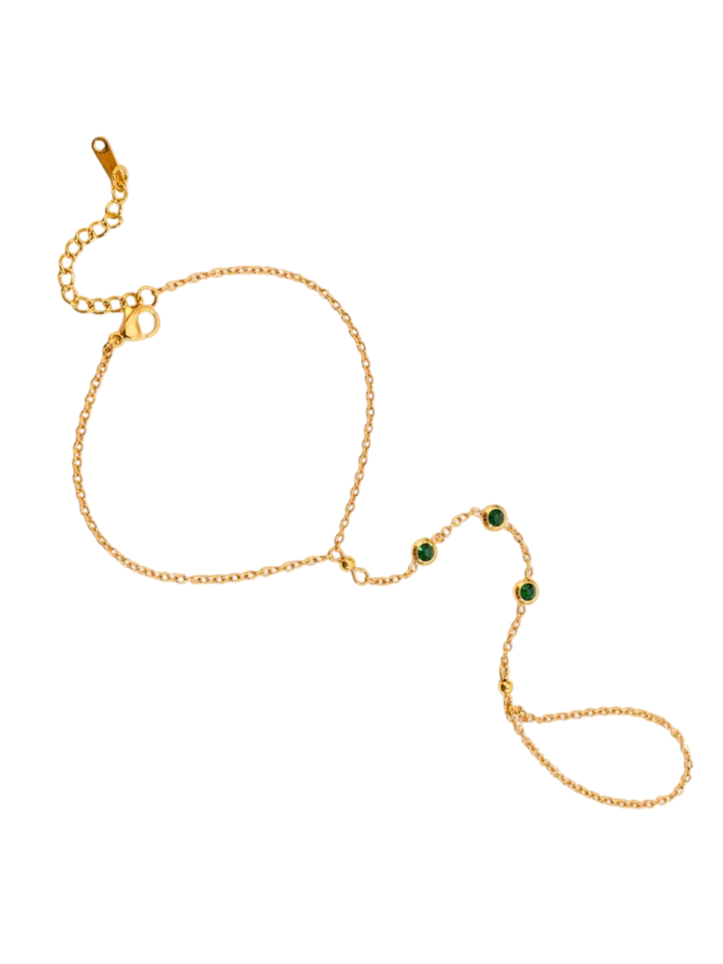 Handchain de acero inoxidable con baño de oro 18K. La parte de la muñeca es regulable hasta 22 cm. Un toque delicado para tu mano con tres cubics color verdes, que le van a dar luz y complementar tus anillos y pulseras.