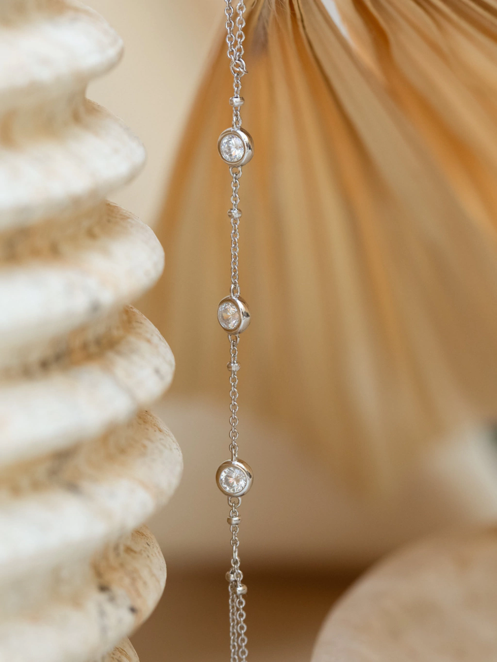 Handchain de acero inoxidable. La parte de la muñeca es regulable hasta 22 cm. Un toque delicado para tu mano con tres cubics que le van a dar luz y complementar tus anillos y pulseras.