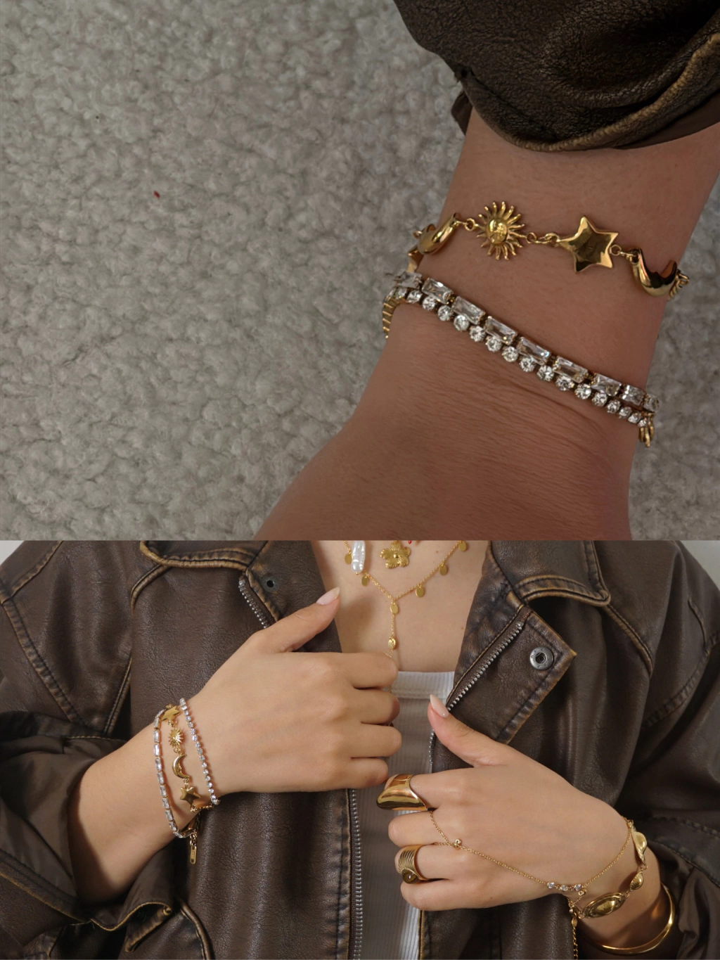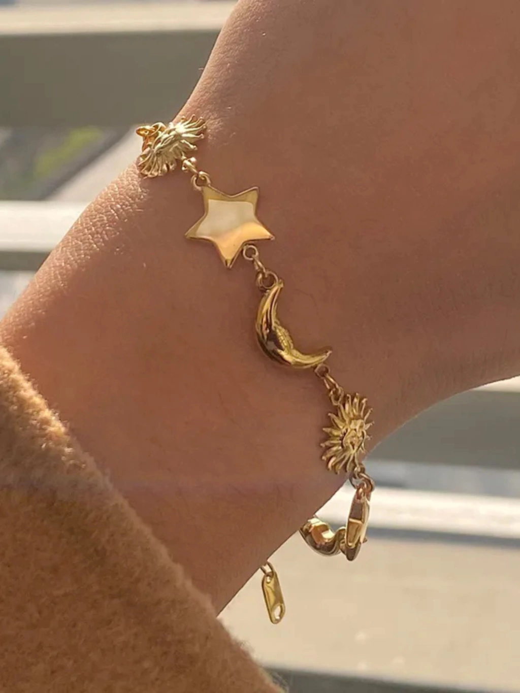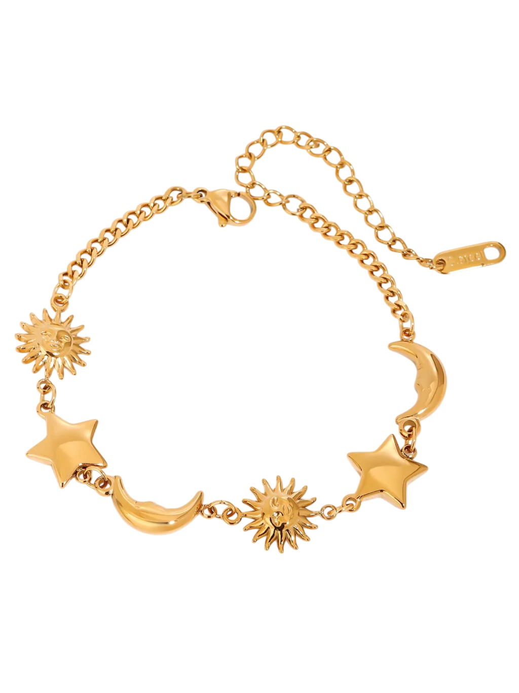 Pulsera de acero inoxidable con baño de oro 18K. Regulable hasta 22 cm aprox. Con lunas, soles y estrellas, una pulsera bohemia con mucho estilo, ideal para darle un toque especial a tu muñeca.