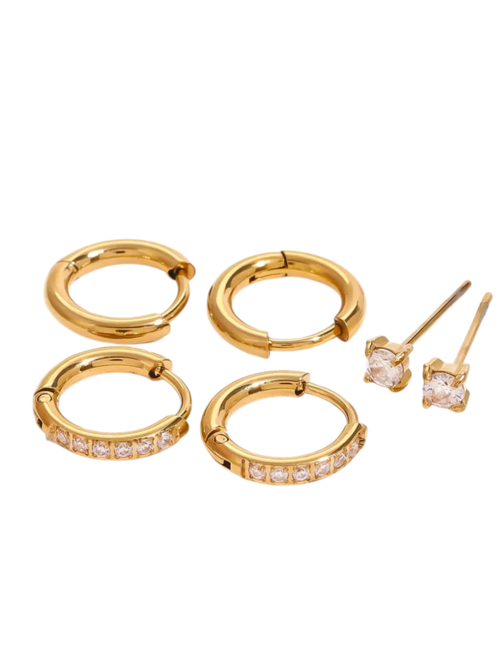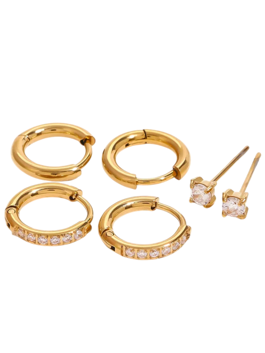 Set de acero inoxidable con baño de oro 18K. Podes adaptarlo a tus perfos como más te guste, animate a cambiar el orden de los aros y a sumarle earcuffs para hacerlo más canchero.
