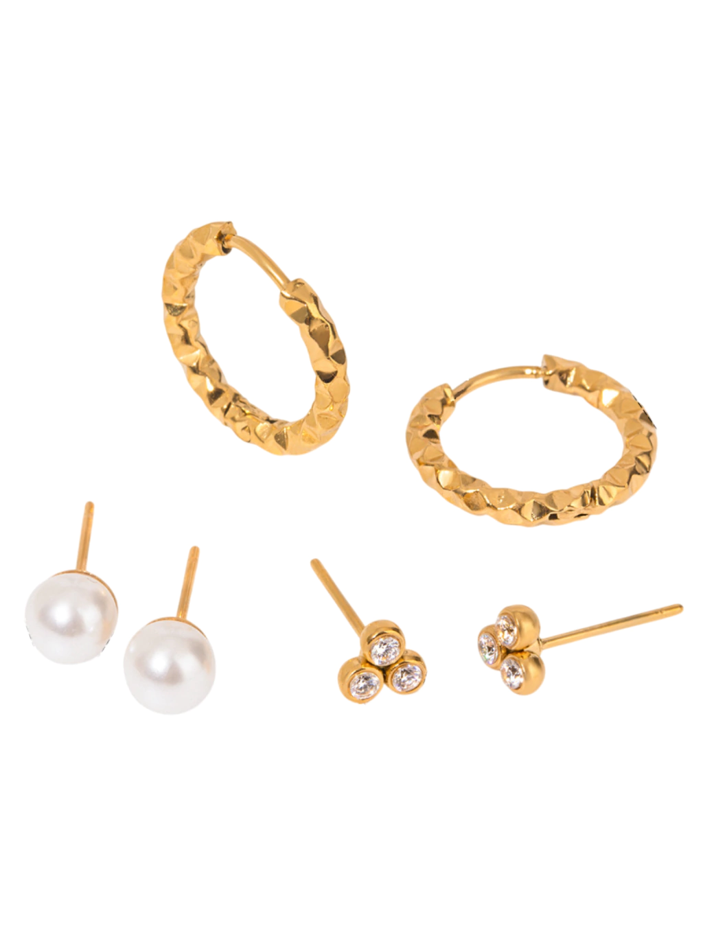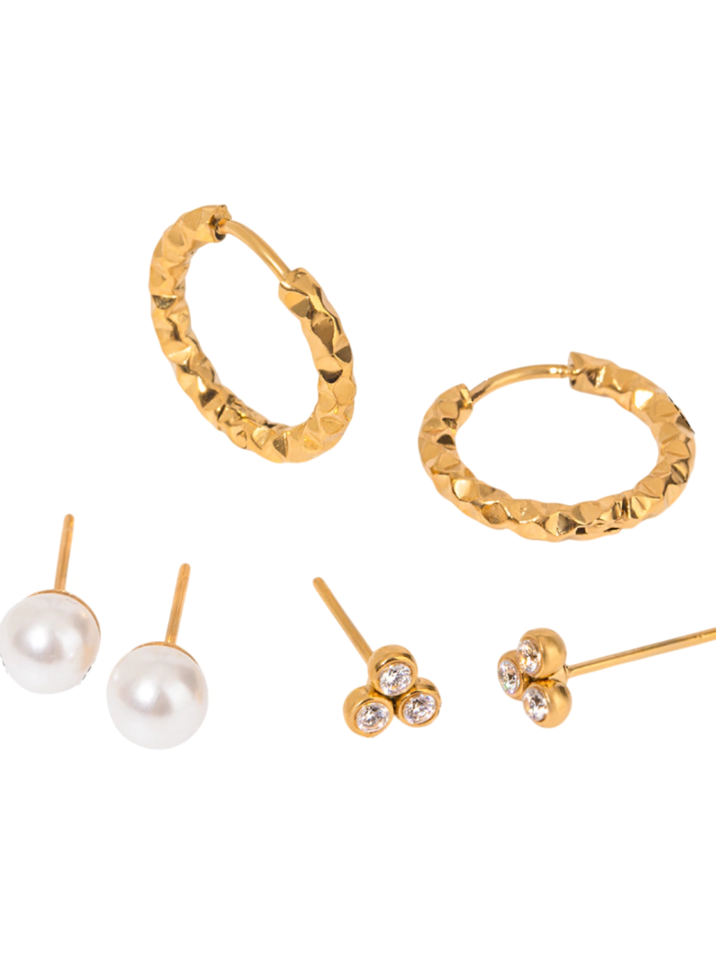Set de acero inoxidable con baño de oro 18K. Podes adaptarlo a tus perfos como más te guste, animate a cambiar el orden de los aros y a sumarle earcuffs para hacerlo más canchero.